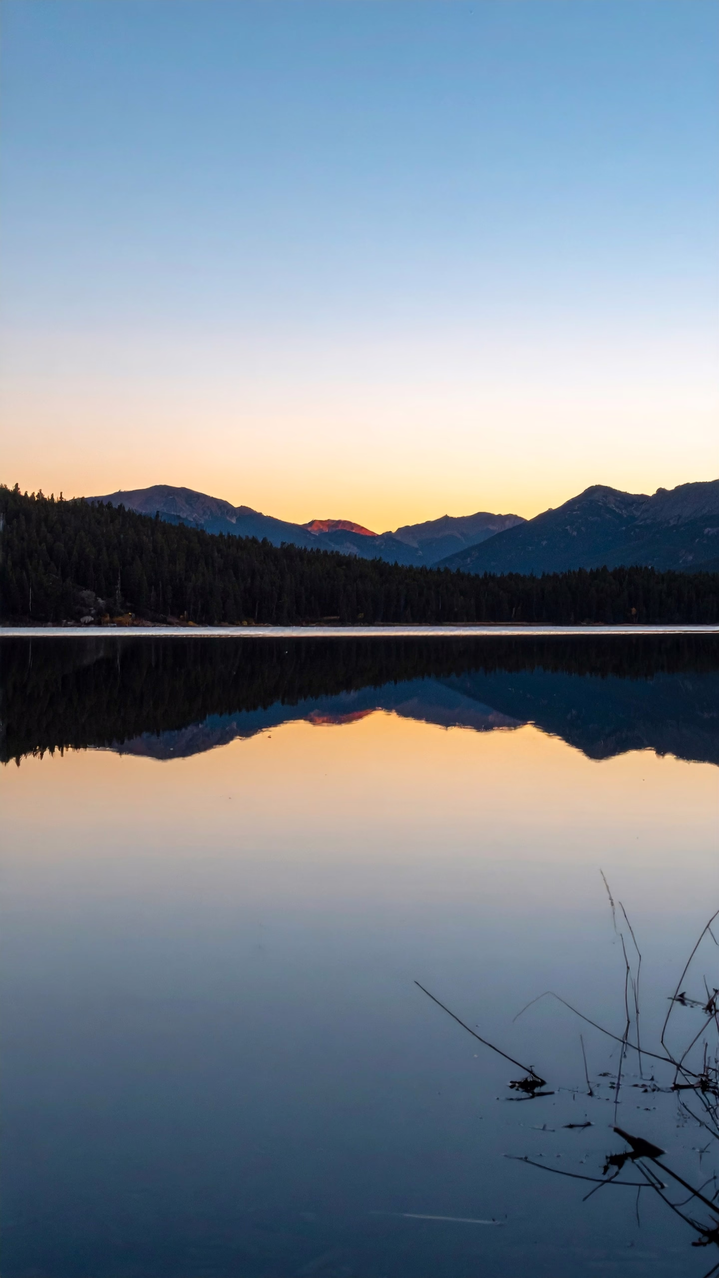 A serene lake reflects a stunning sunset with silhouetted mountains