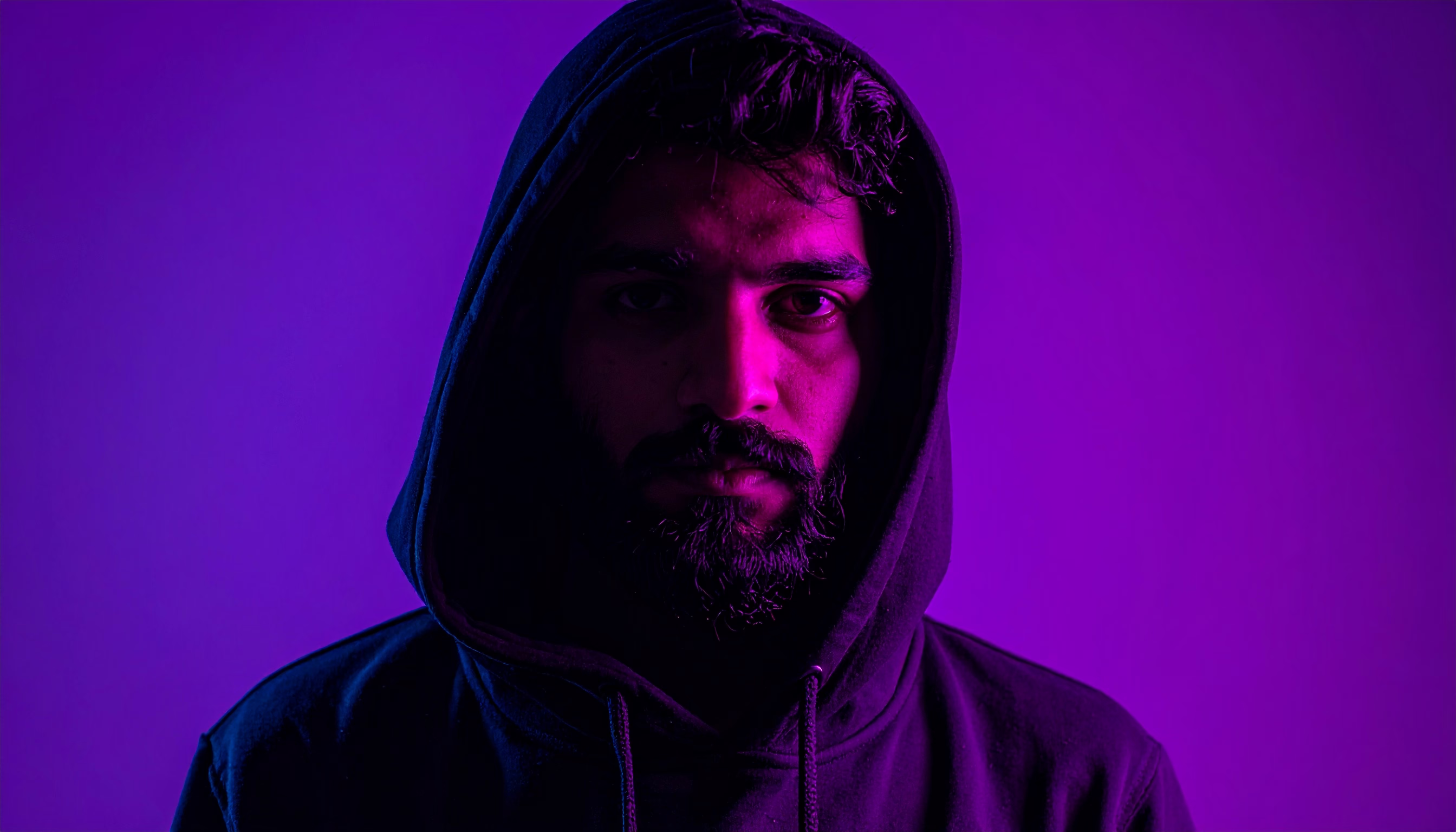 A person in a hooded sweatshirt is lit by vibrant purple and pink hues