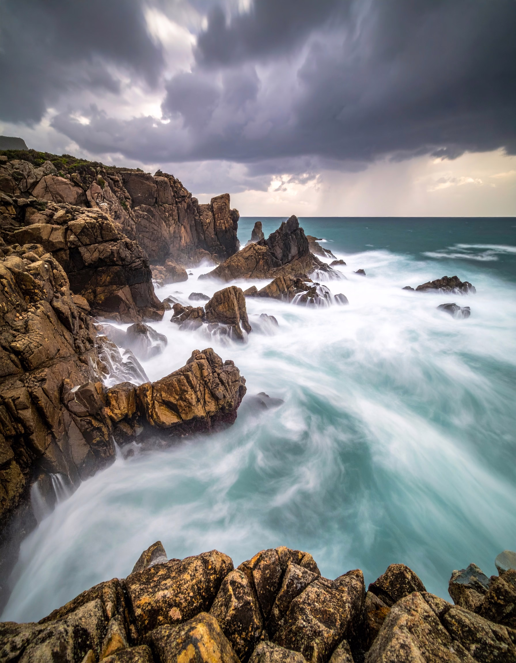 This image is classified with the tags: coastal, cliffs, ocean, waves, stormy sky.