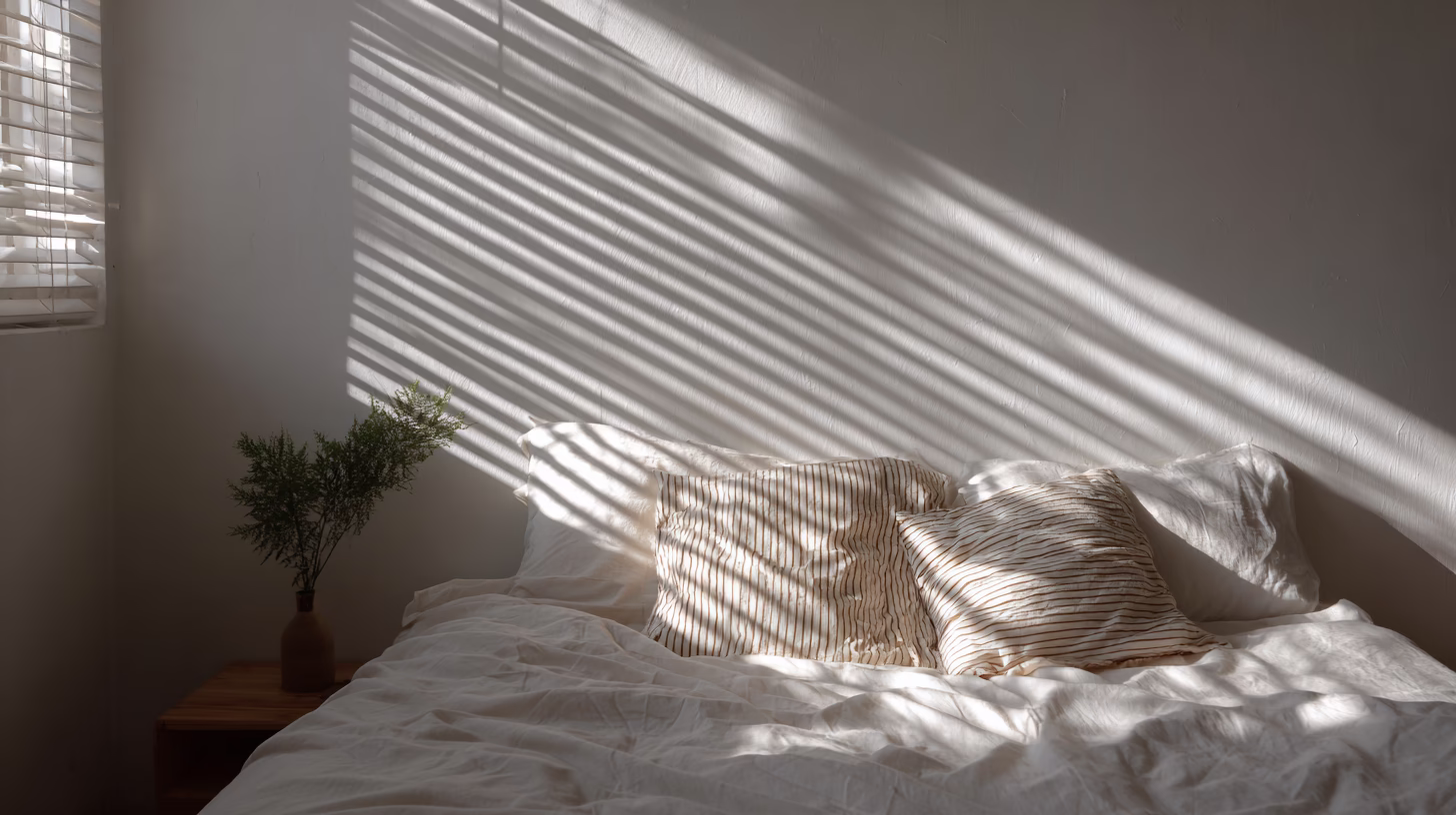 This image showcases a cozy bedroom bathed in soft natural light filtering through blinds, casting striped shadows on the bed. The color palette is predominantly neutral, featuring shades of white and...