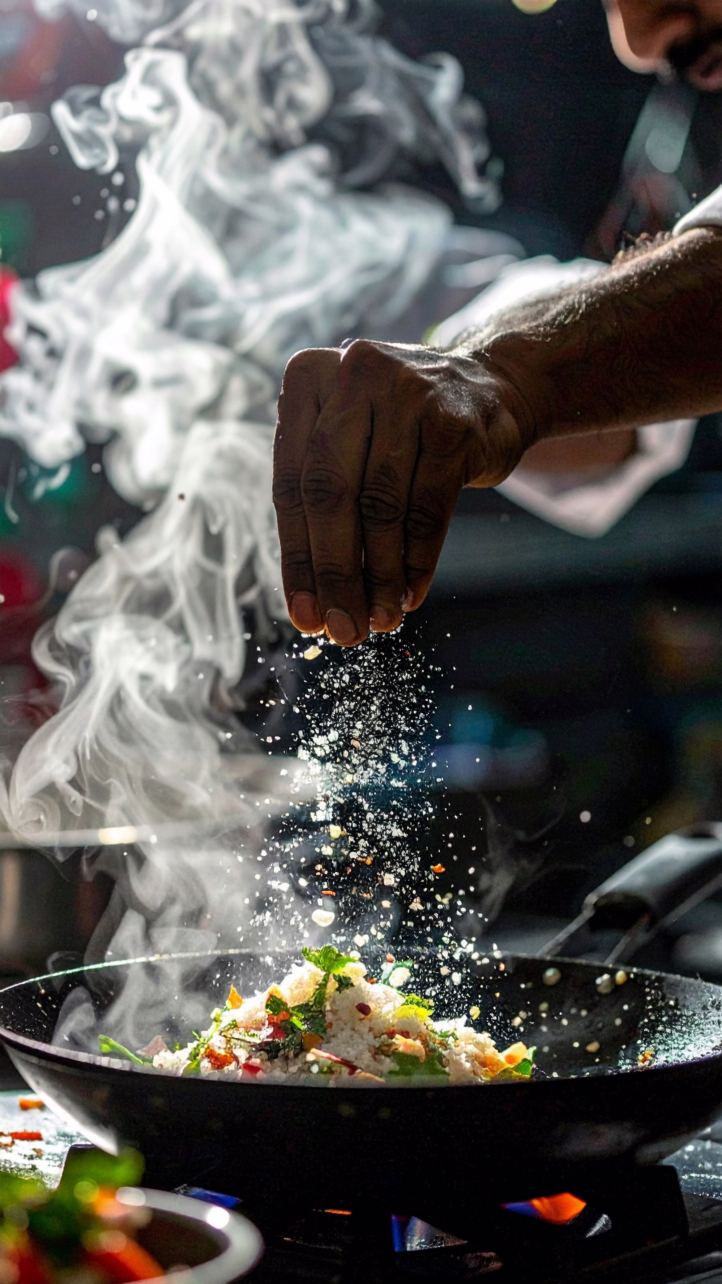 A chef skillfully sprinkles spices over a sizzling dish in a pan