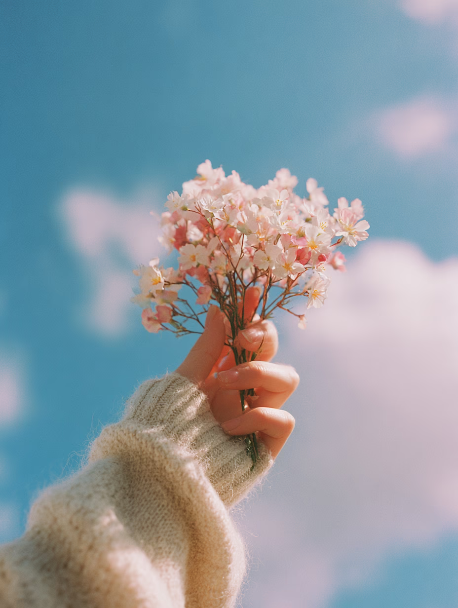 This image showcases a hand holding a delicate bouquet of flowers against a light blue sky. The flowers feature soft shades of pink and white, while the hand is clearly human, adorned in a light, textured sweater. The sky is partly cloudy, with diffuse white clouds adding depth to the scene.