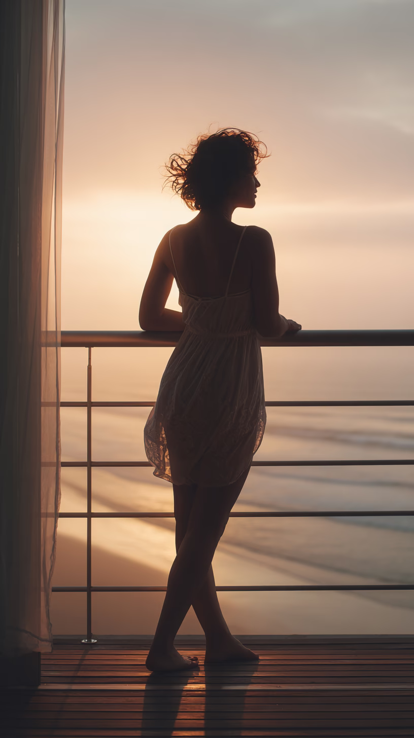 A silhouette of a woman in a light dress watching the sunset from a balcony, with the sea visible in the background. The soft evening light creates a tranquil and reflective atmosphere, perfect for those seeking inspiration or a serene moment.