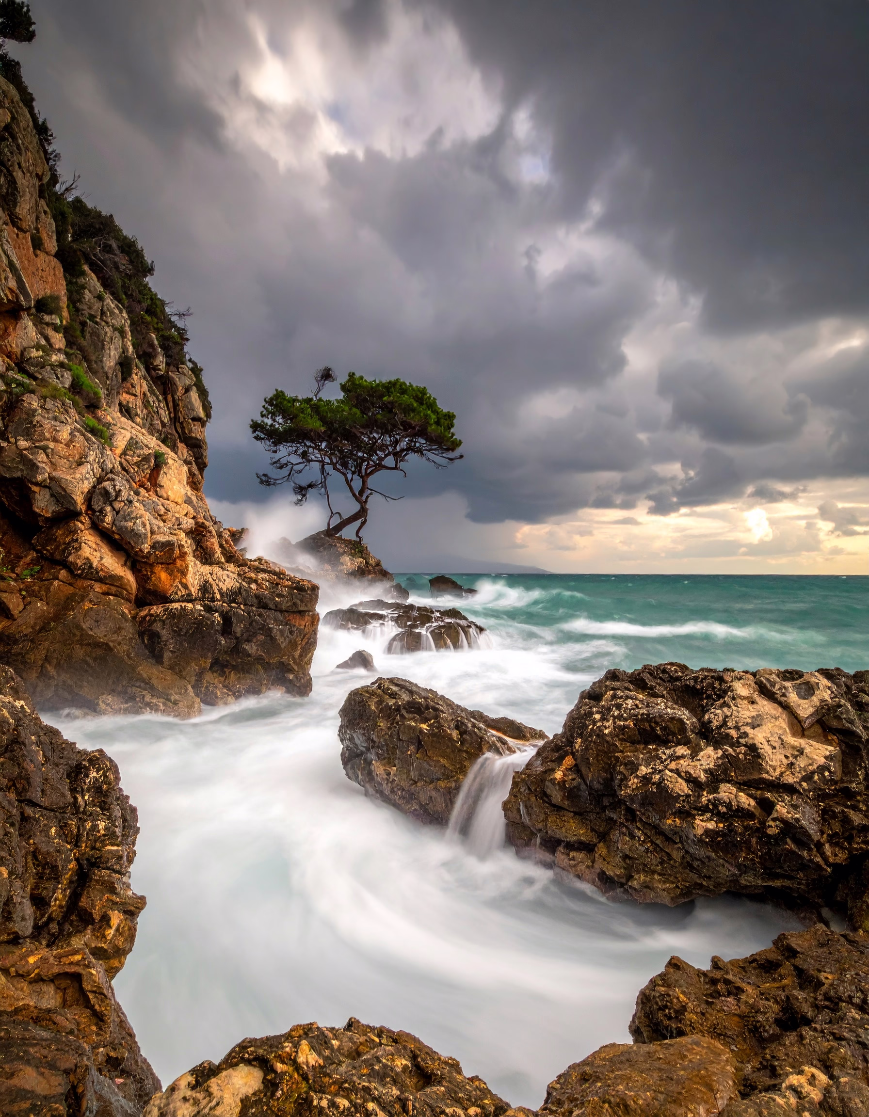 This image is classified with the tags: coastal landscape, solitary tree, rugged cliffs, dramatic sky, swirling waves.
