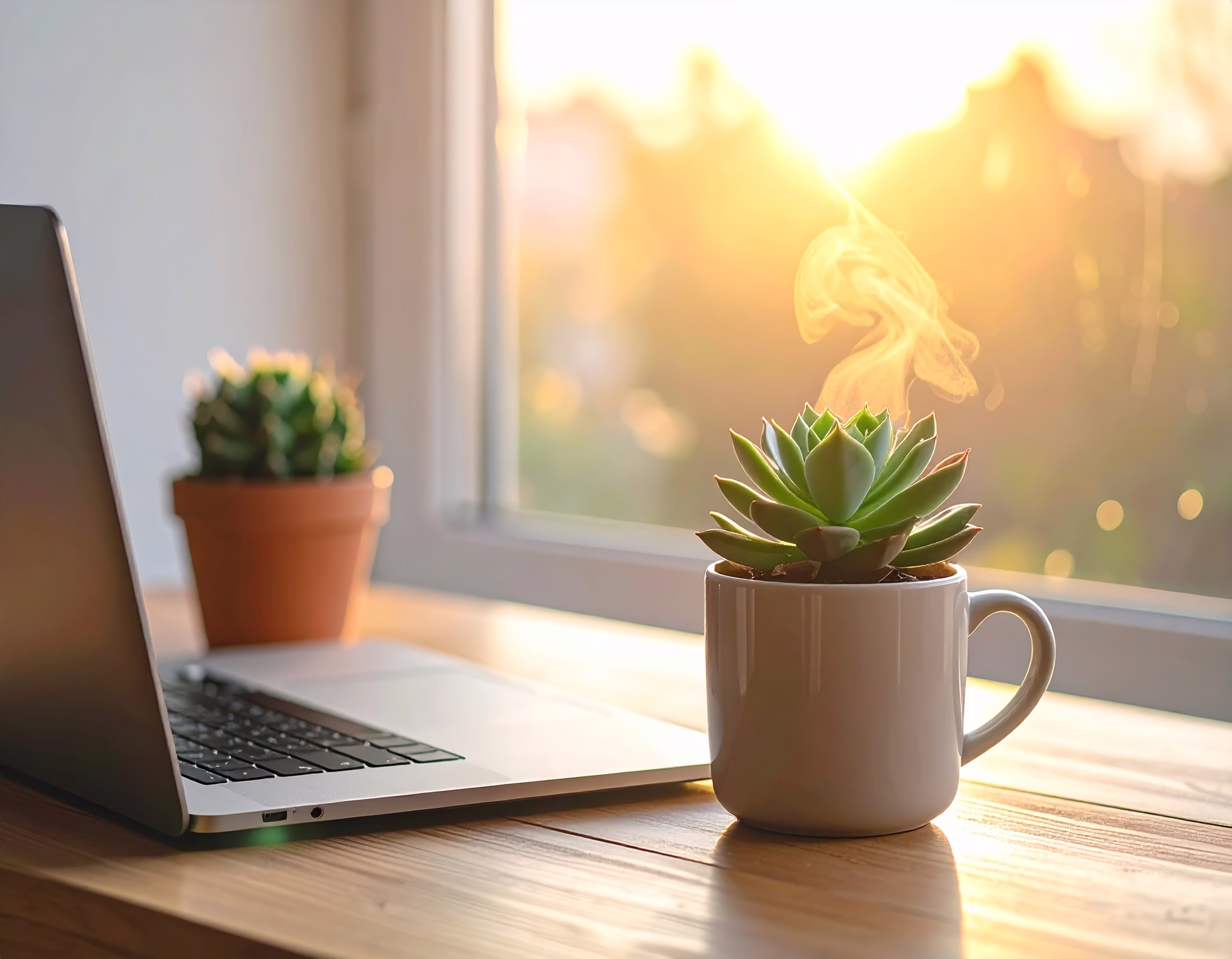 A sleek laptop sits on a wooden desk next to a steaming mug under warm sunlight