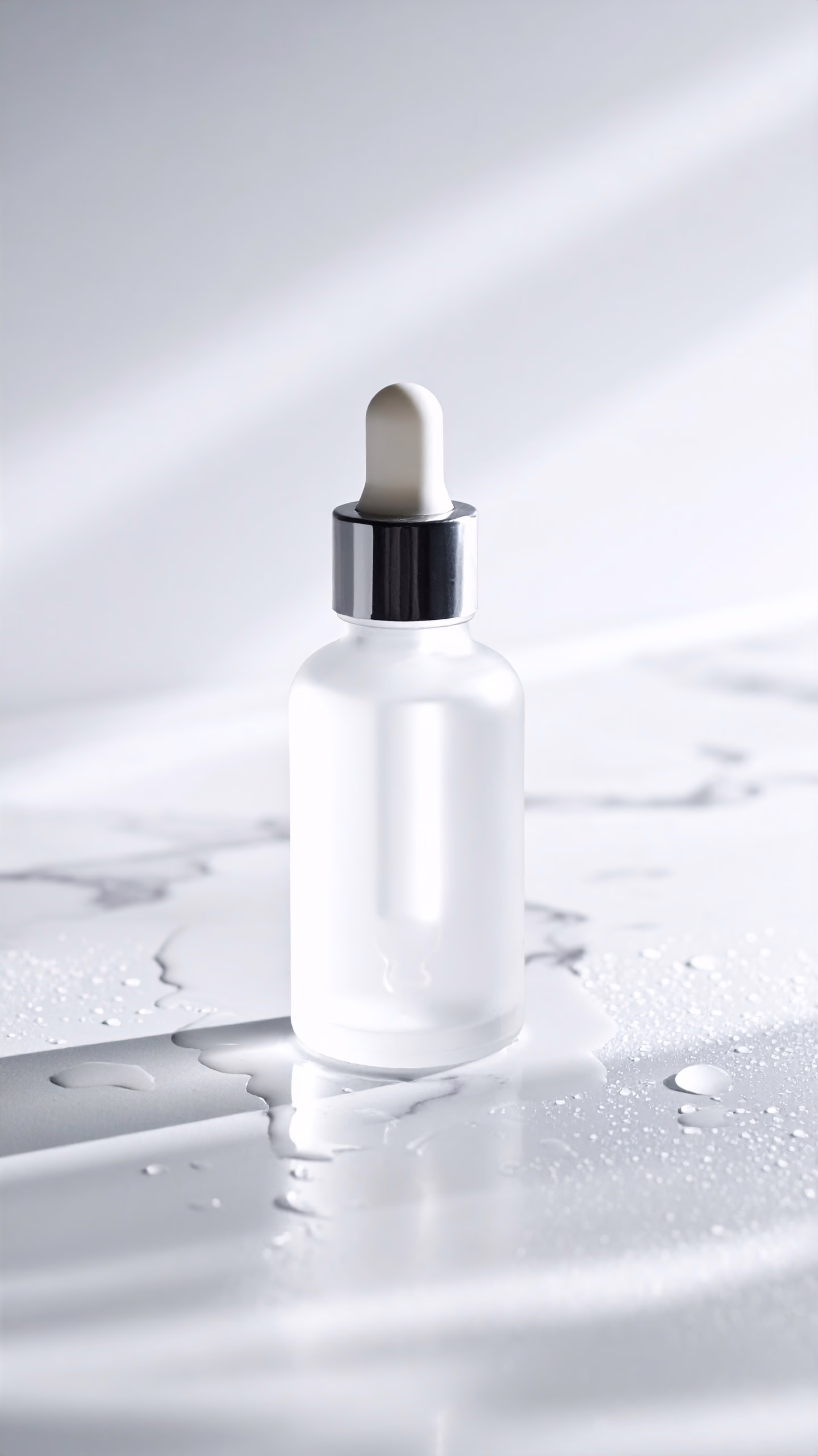 A sleek glass dropper bottle sits elegantly on a white marble surface, exuding a sense