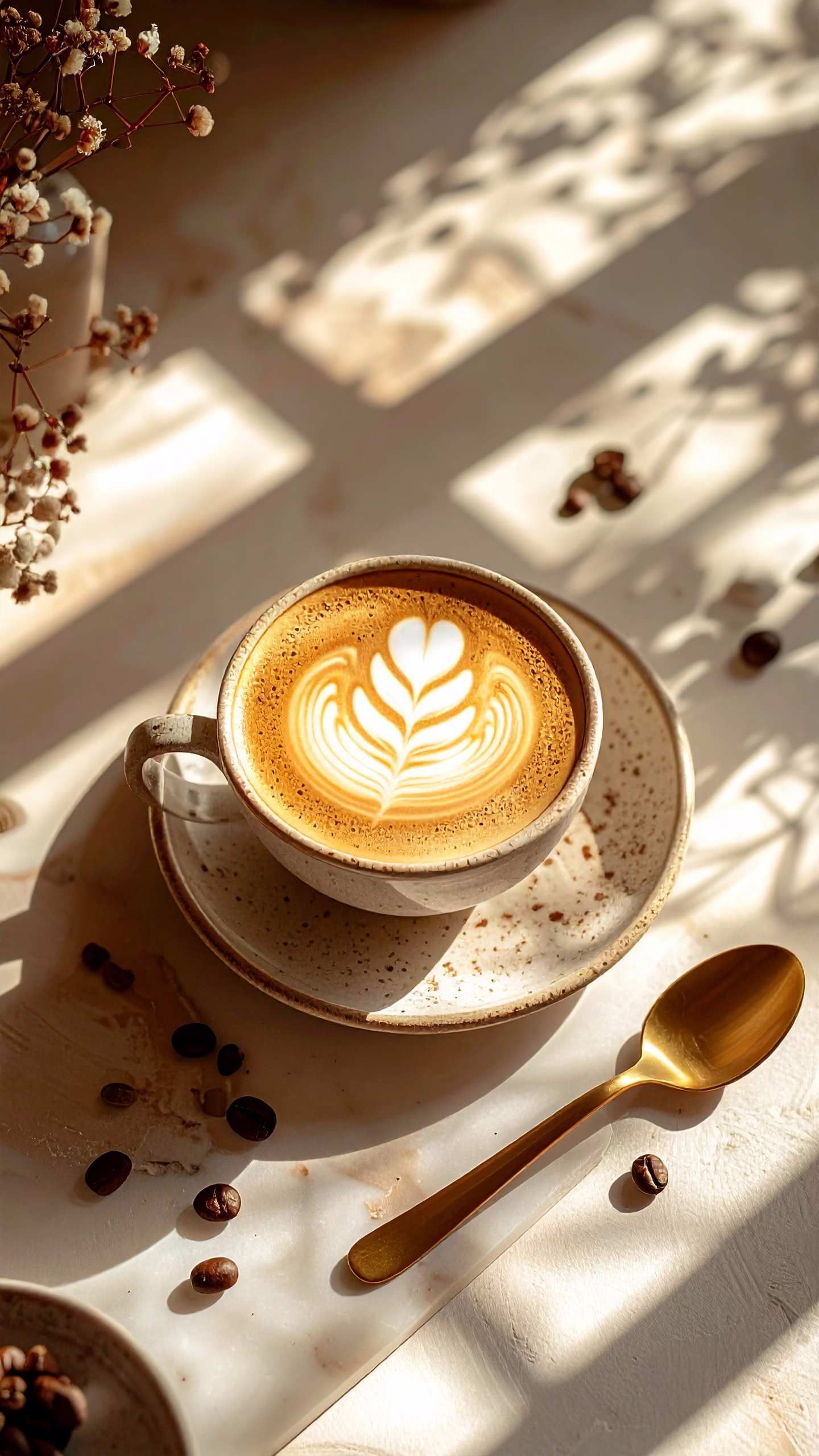 Ideal for coffee lovers seeking an aesthetic morning ritual, this cappuccino offers both a visual and sensory delight. The delicate latte art forms a heart pattern, enhancing its appeal. Perfect for c...