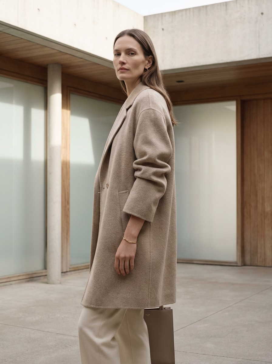 A woman stands elegantly in a neutral-toned coat within a minimalist architectural setting