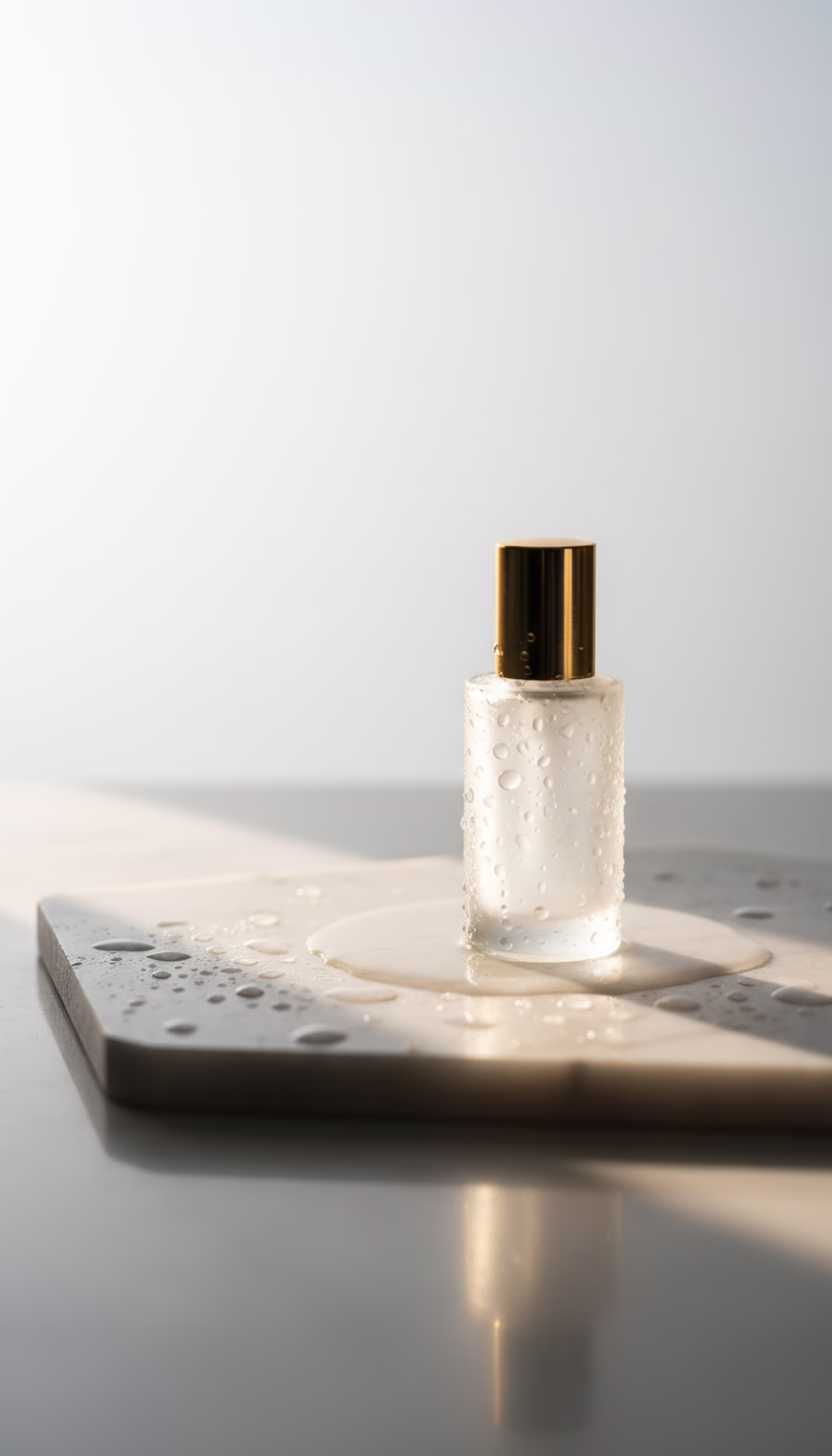 Ideal for luxury fragrance brands, it conveys sophistication and modernity. The bottle is adorned with droplets, suggesting freshness and purity. Perfect for advertising upscale perfumes or skincare p...