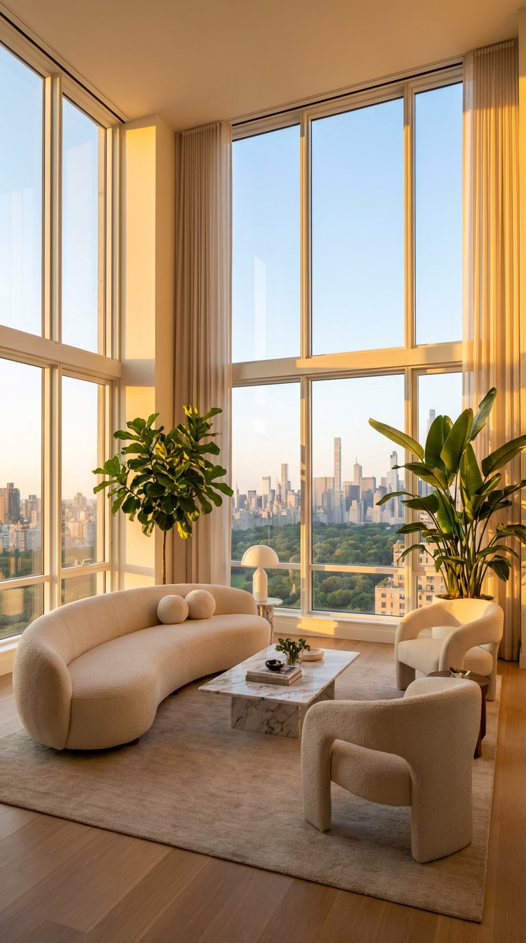 Ideal for showcasing contemporary furniture and home decor. The room features a chic rounded sofa, elegant marble coffee table, and plush armchairs. Perfect for luxury interior design inspirations in urban settings. The warm natural light enhances...