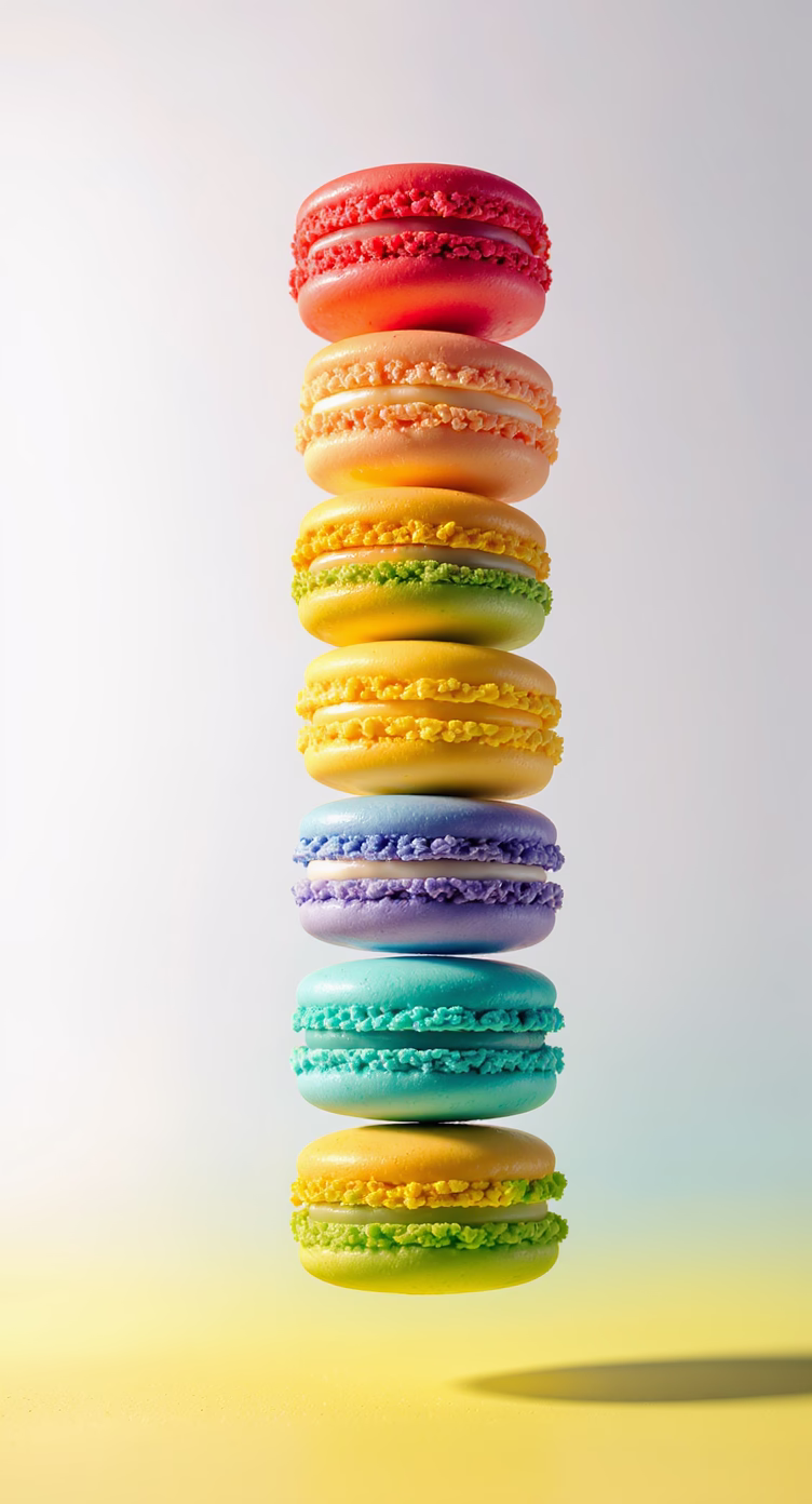 A vibrant stack of colorful macarons stands tall against a soft gradient background