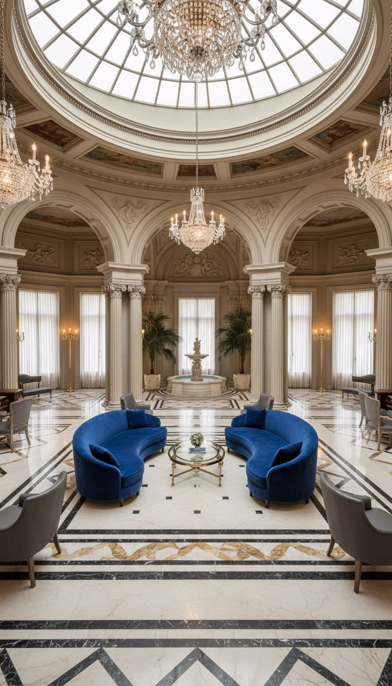 Luxurious hotel lobby with grand chandeliers and elegant blue seating