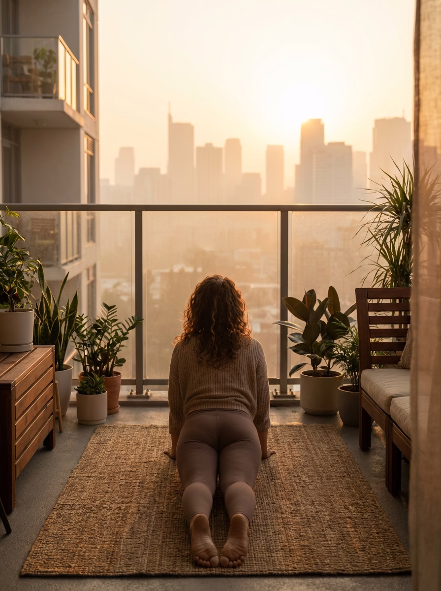 A woman practices yoga on a high-rise balcony at sunset, overlooking a cityscape