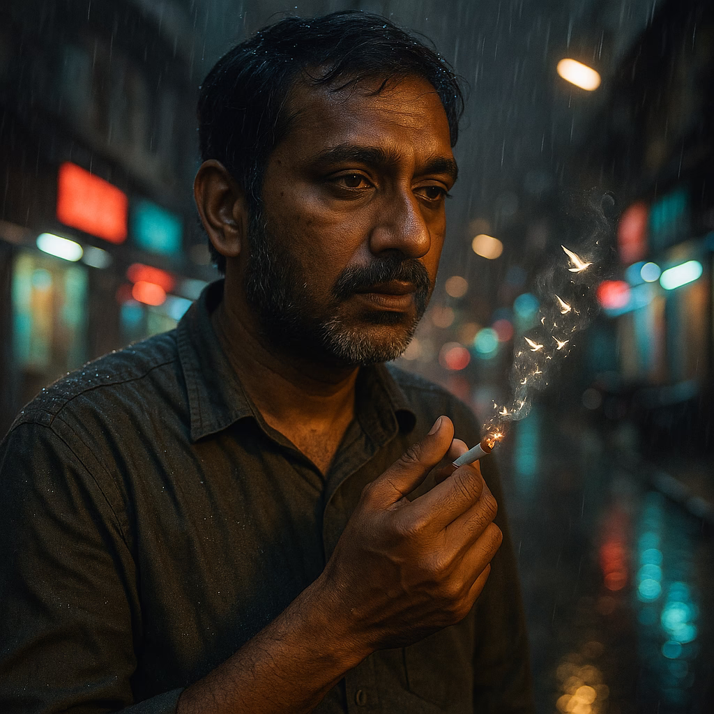 A man stands in a dimly lit street, holding a lit cigarette with a contemplative expression
