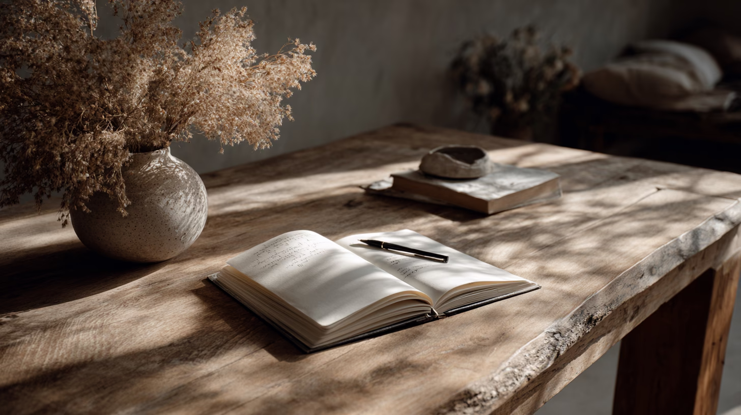 Rustic Wooden Table with Dried Flowers and Open Notebook