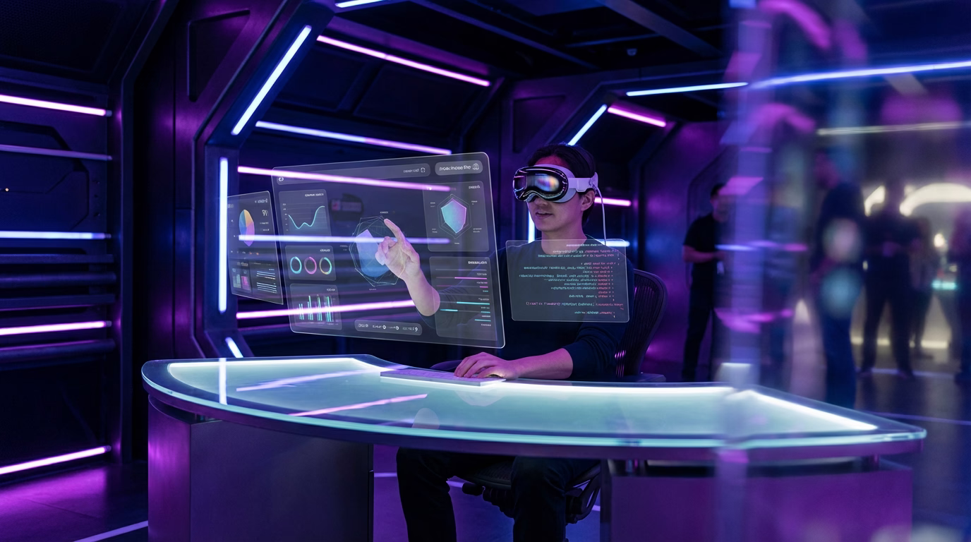 This image is classified with the tags: futuristic workspace, augmented reality, holographic display, neon lighting, tech innovation.