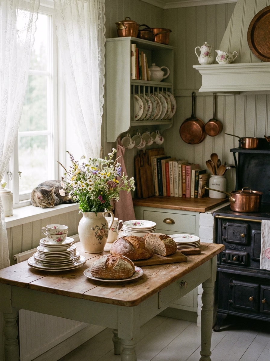 A cozy rustic kitchen features a wooden table adorned with fresh bread and floral china