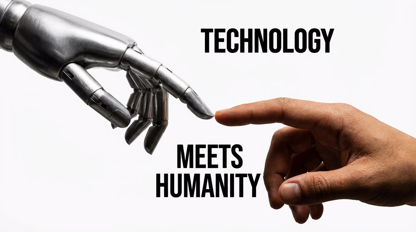 A robotic hand reaching out to touch a human finger symbolizes the fusion of technology and humanity