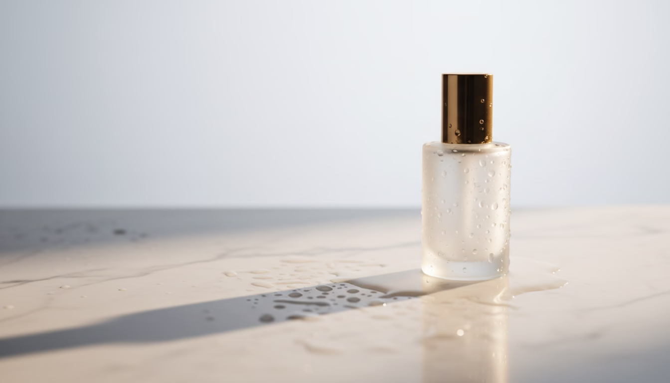 A sleek perfume bottle sits elegantly on a white marble surface
