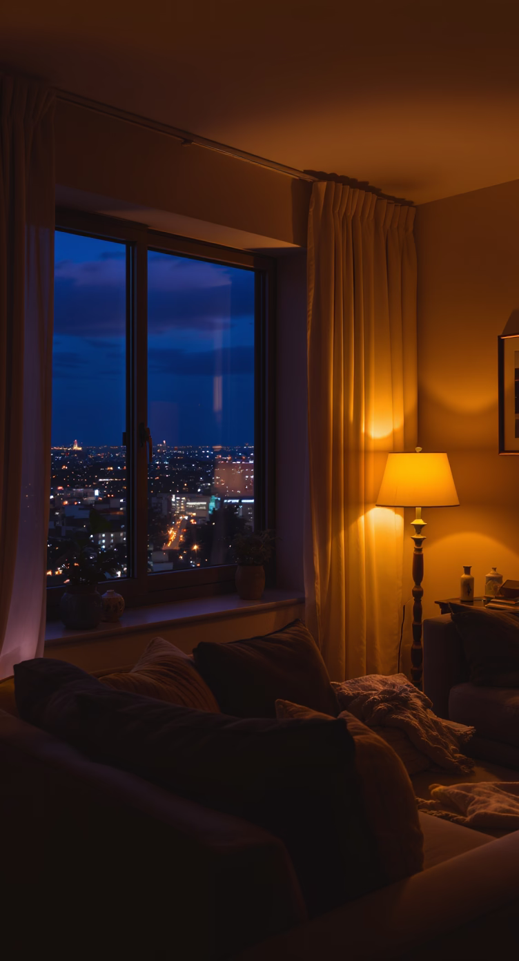 This setting is ideal for creating a relaxing atmosphere in your home. The city view through the window adds a touch of urban elegance. Perfect for unwinding after a long day or entertaining guests in the evening. The combination of ambient...