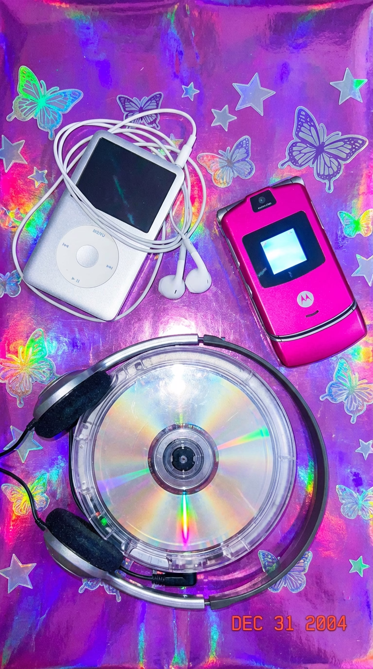 These devices, including a silver MP3 player, a pink flip phone, and a portable CD player with headphones, are iconic symbols of the era. Each item showcases the technological innovation and design tr...