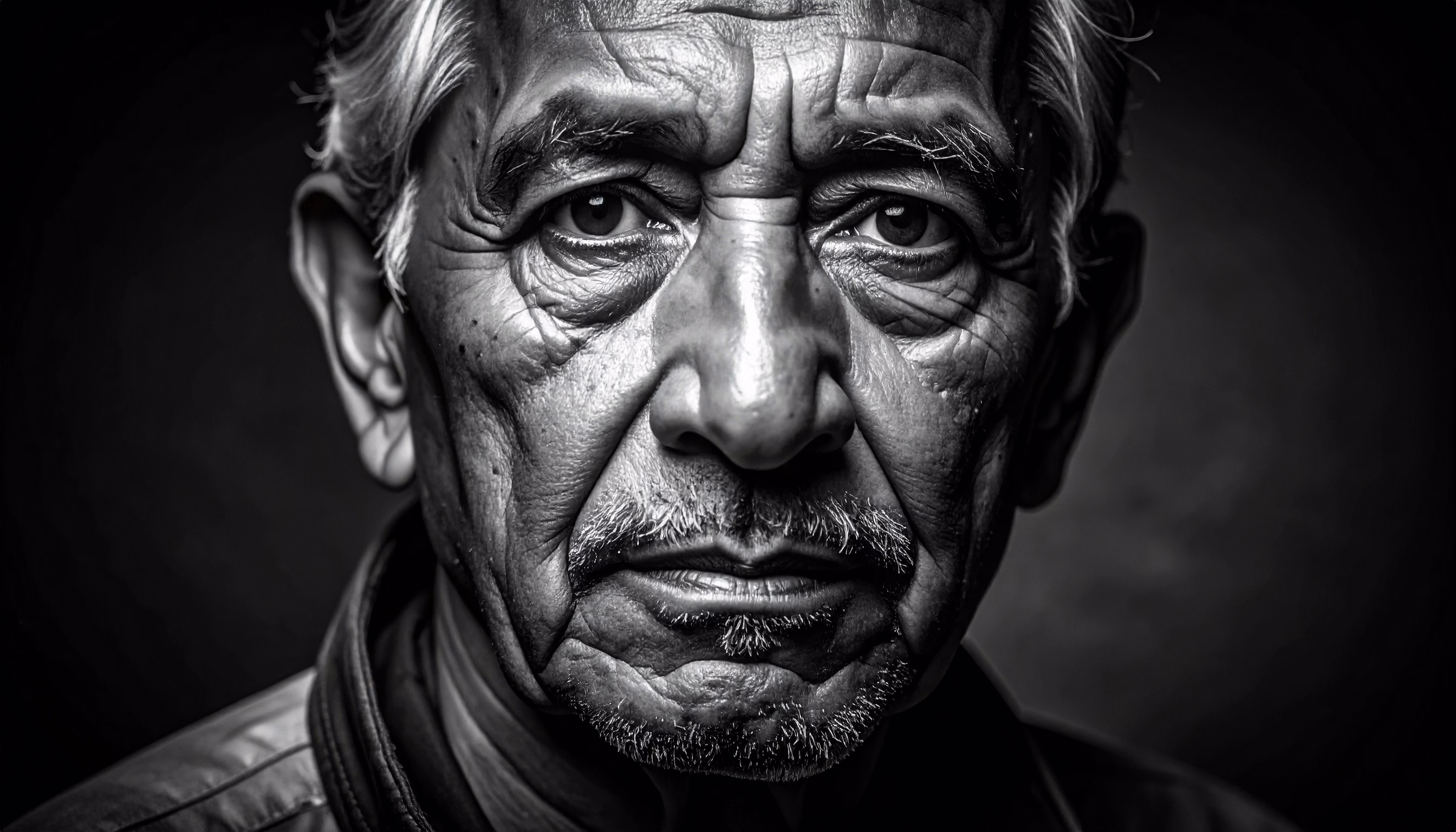 A striking black and white portrait of an elderly man