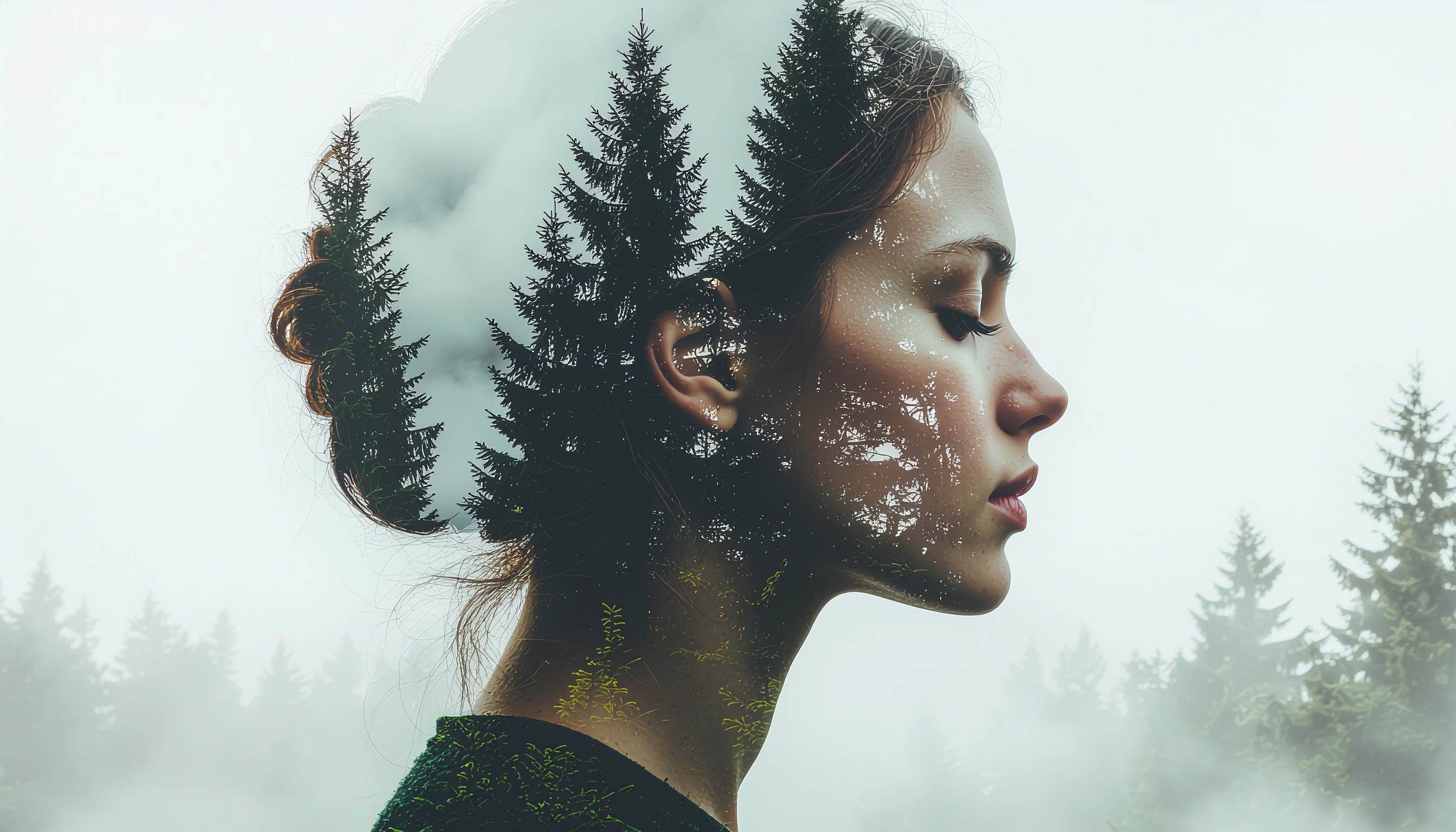 This artistic image conveys a sense of unity between humanity and nature, perfect for eco-friendly brand campaigns. The misty forest overlays her silhouette, creating a tranquil and harmonious visual....