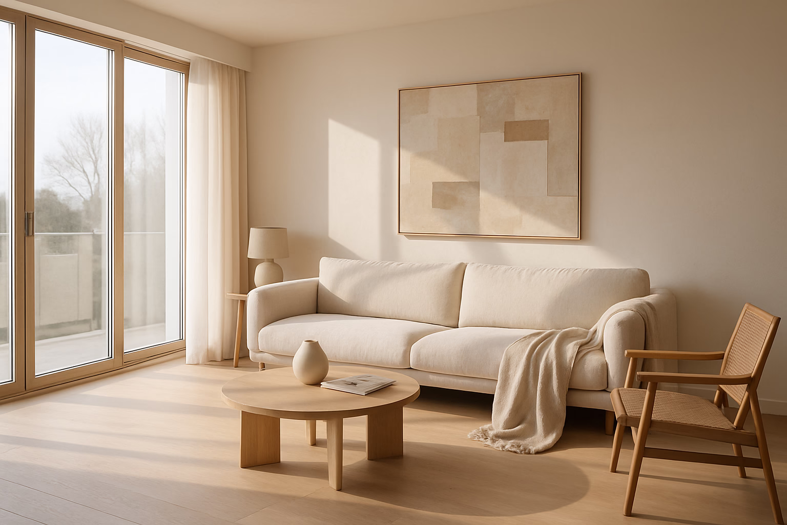 This setup is perfect for those seeking a serene and stylish space for relaxation or entertaining guests. Natural light floods the room through large windows, highlighting the soft textures and neutra...