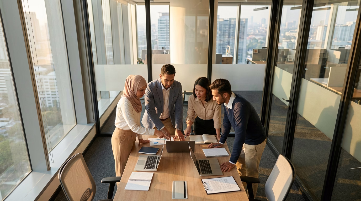 A diverse team collaborates in a modern office with city views