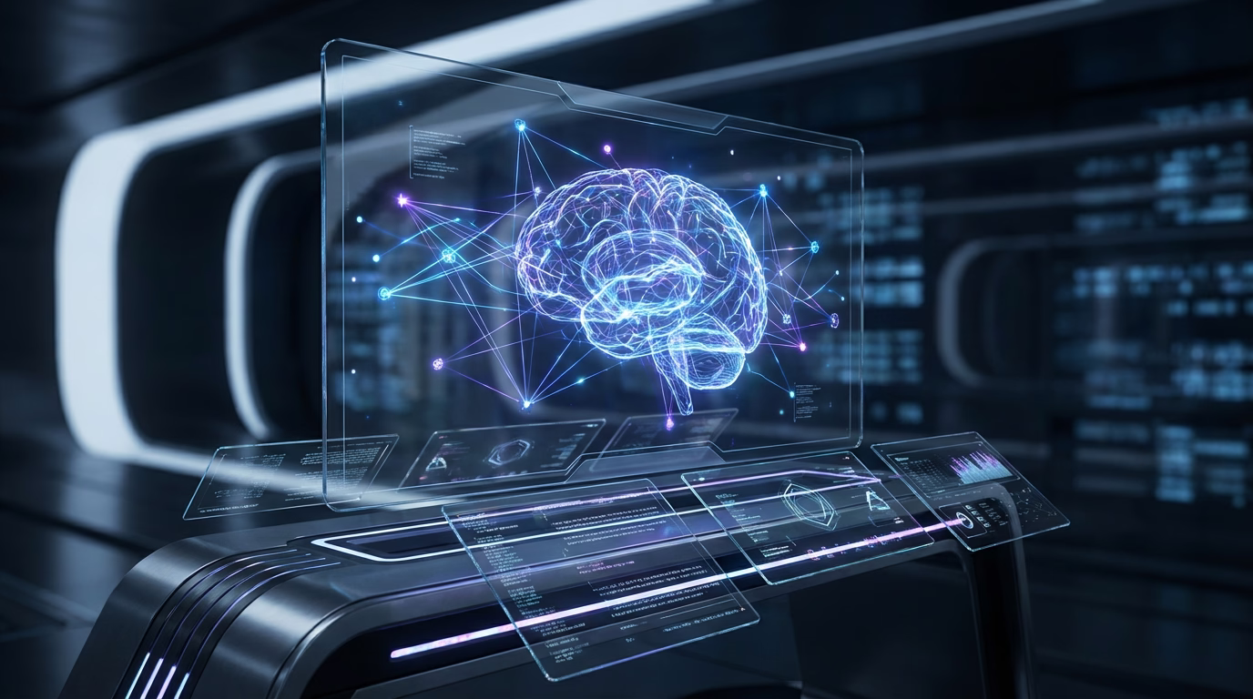 A futuristic digital interface displays a holographic brain with interconnecting lines