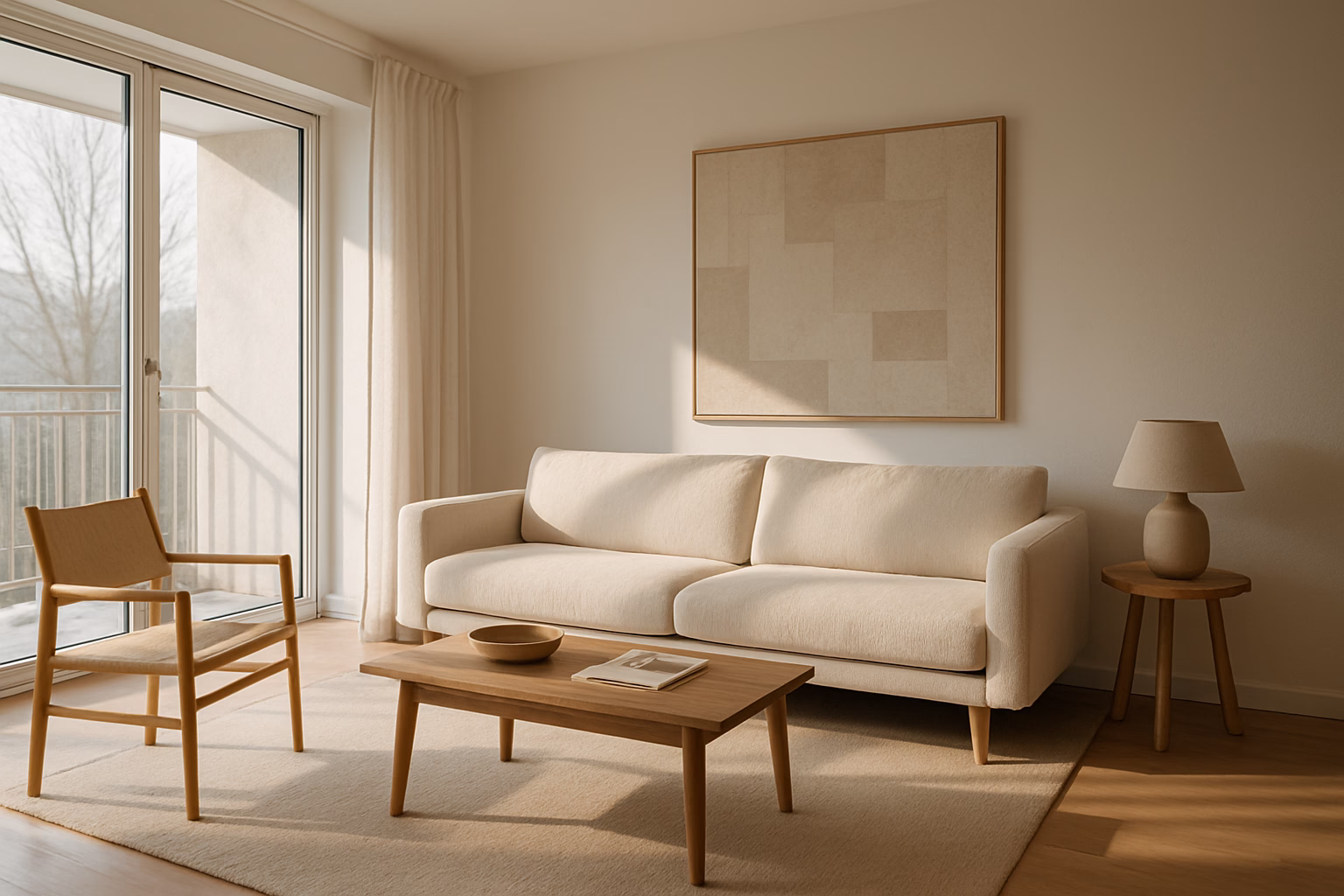 A cozy Scandinavian-style living room features a cream-colored sofa, wooden chair, and coffee table