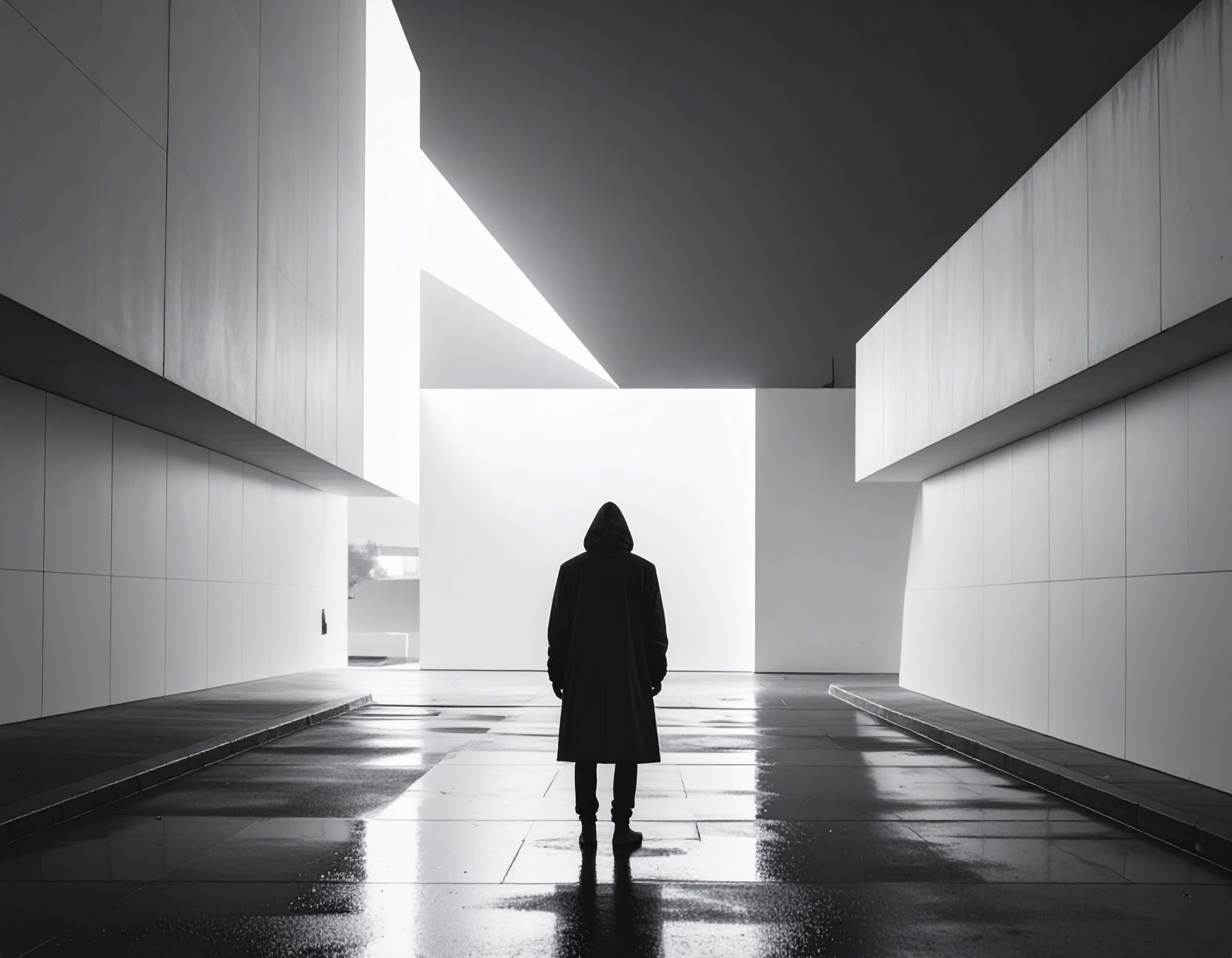 This image evokes a sense of mystery and introspection, making it ideal for expressing themes of solitude in urban environments. The geometric lines and contrasting light create a striking visual effe...