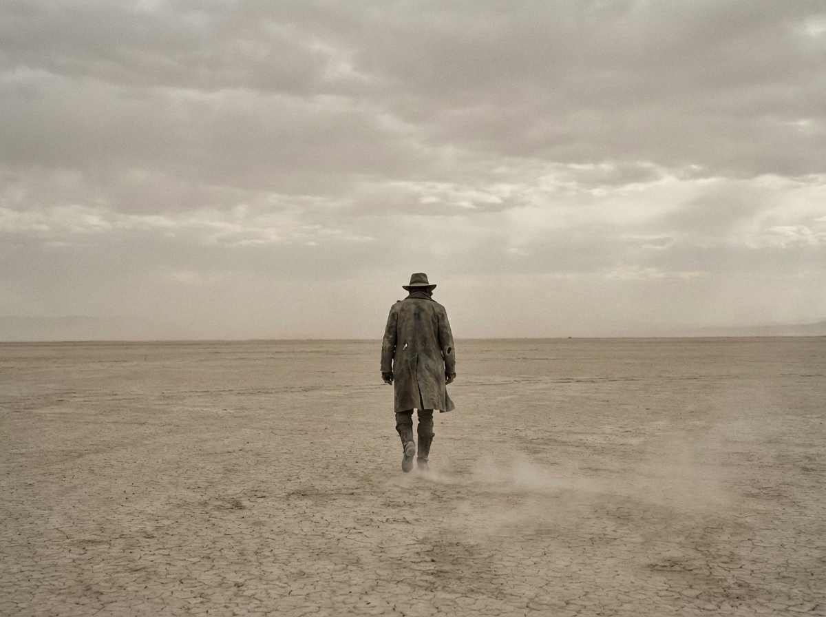 A lone figure in a trench coat walks across a barren desert expanse under a cloudy sky