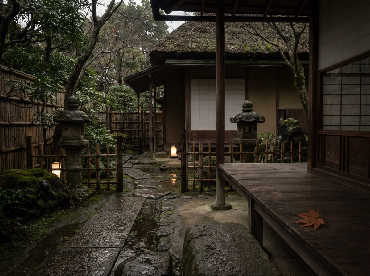 This image is classified with the tags: Japanese garden, traditional architecture, wooden structure, stone path, serenity.