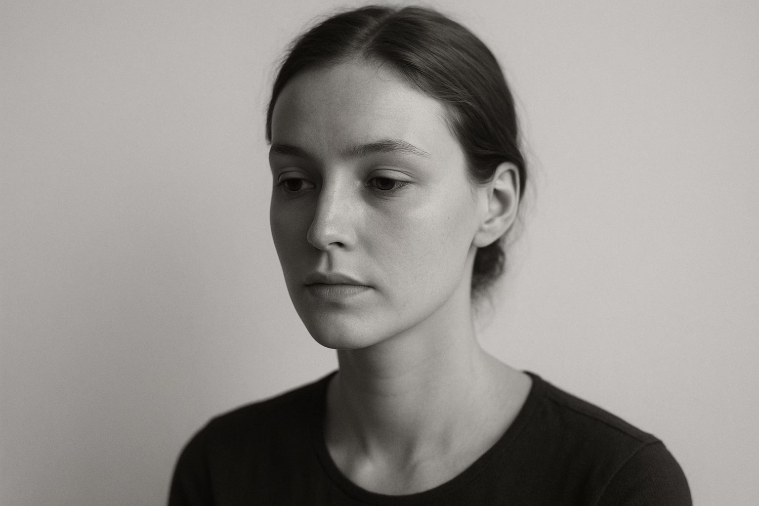 This image is perfect for use in artistic projects or editorial publications aiming to convey emotion. The soft lighting and monochrome tones lend a timeless and introspective quality to the photograp...