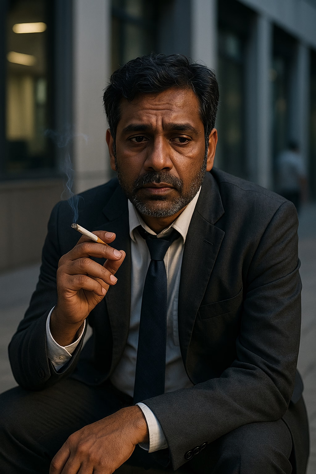 A man in a suit holds a cigarette, sitting against an urban building backdrop