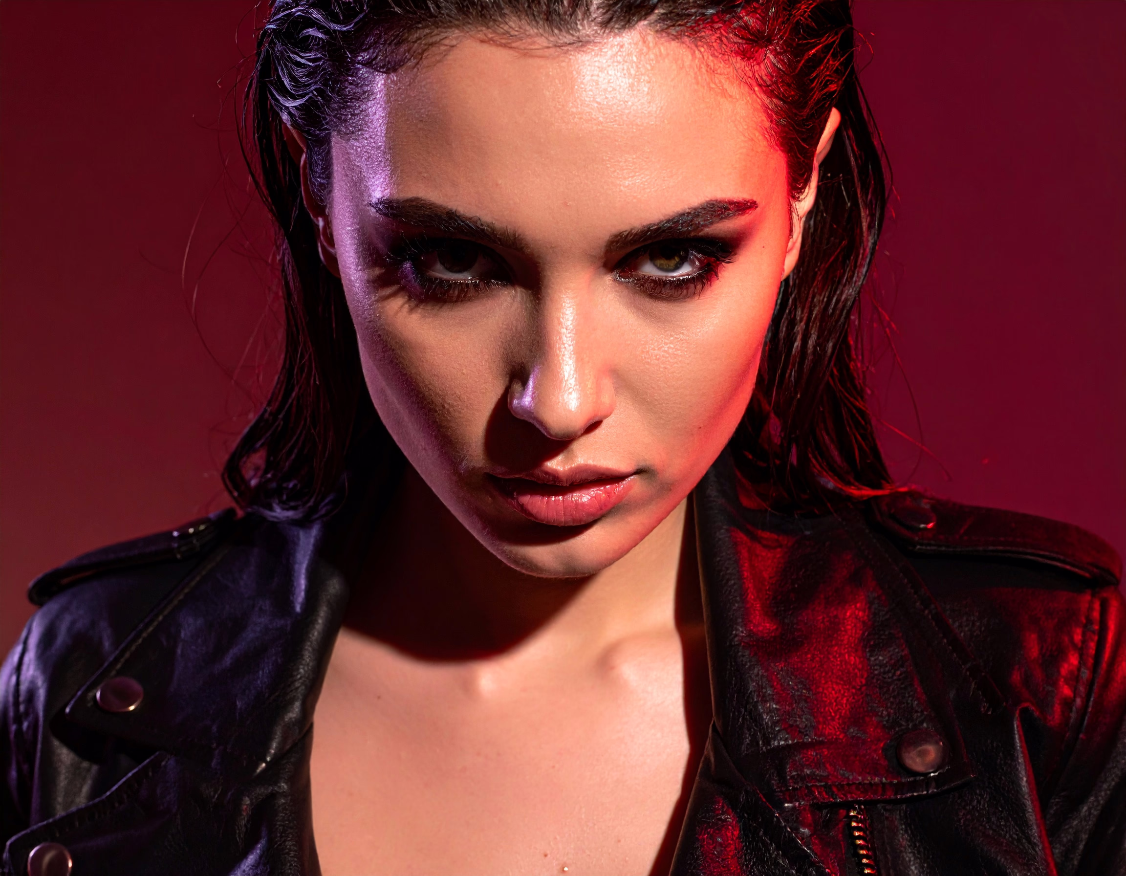 A striking portrait of a person in a black leather jacket against a bold red backdrop