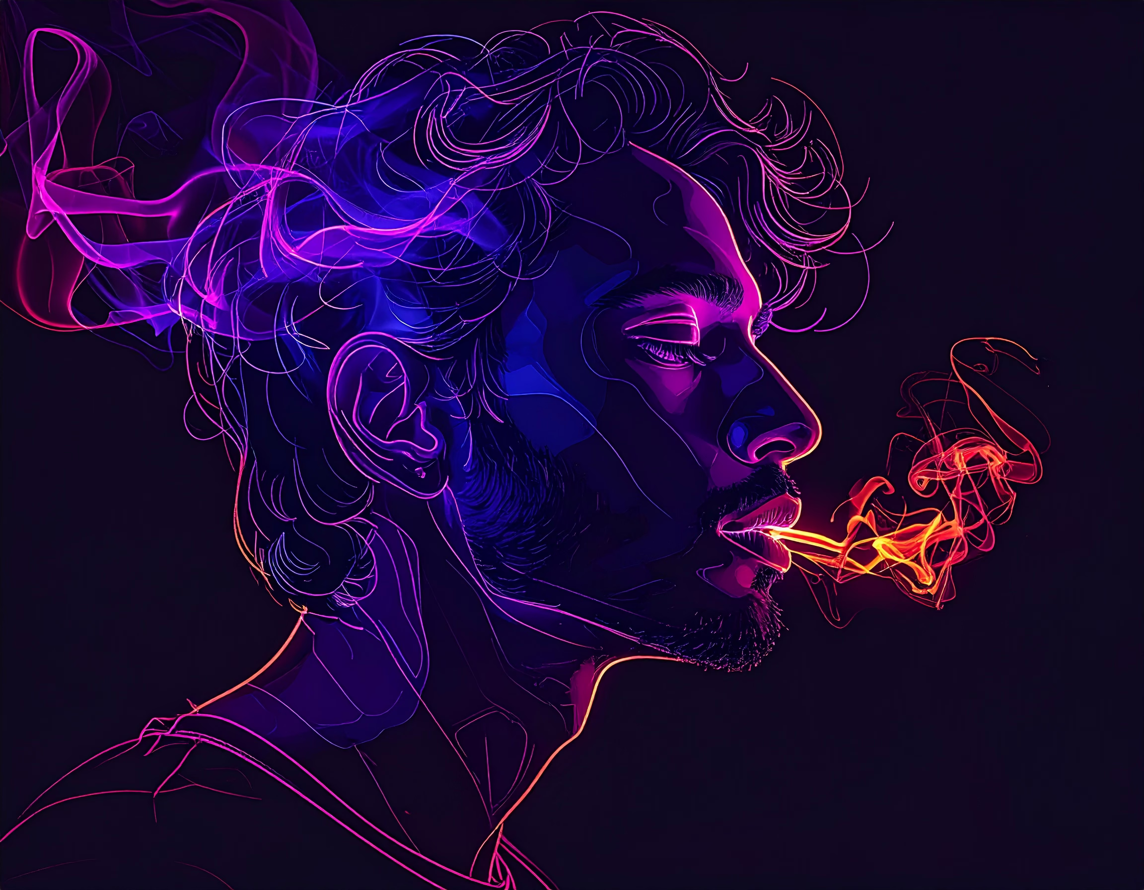 A vibrant digital illustration features a stylized profile of a man exhaling colorful smoke