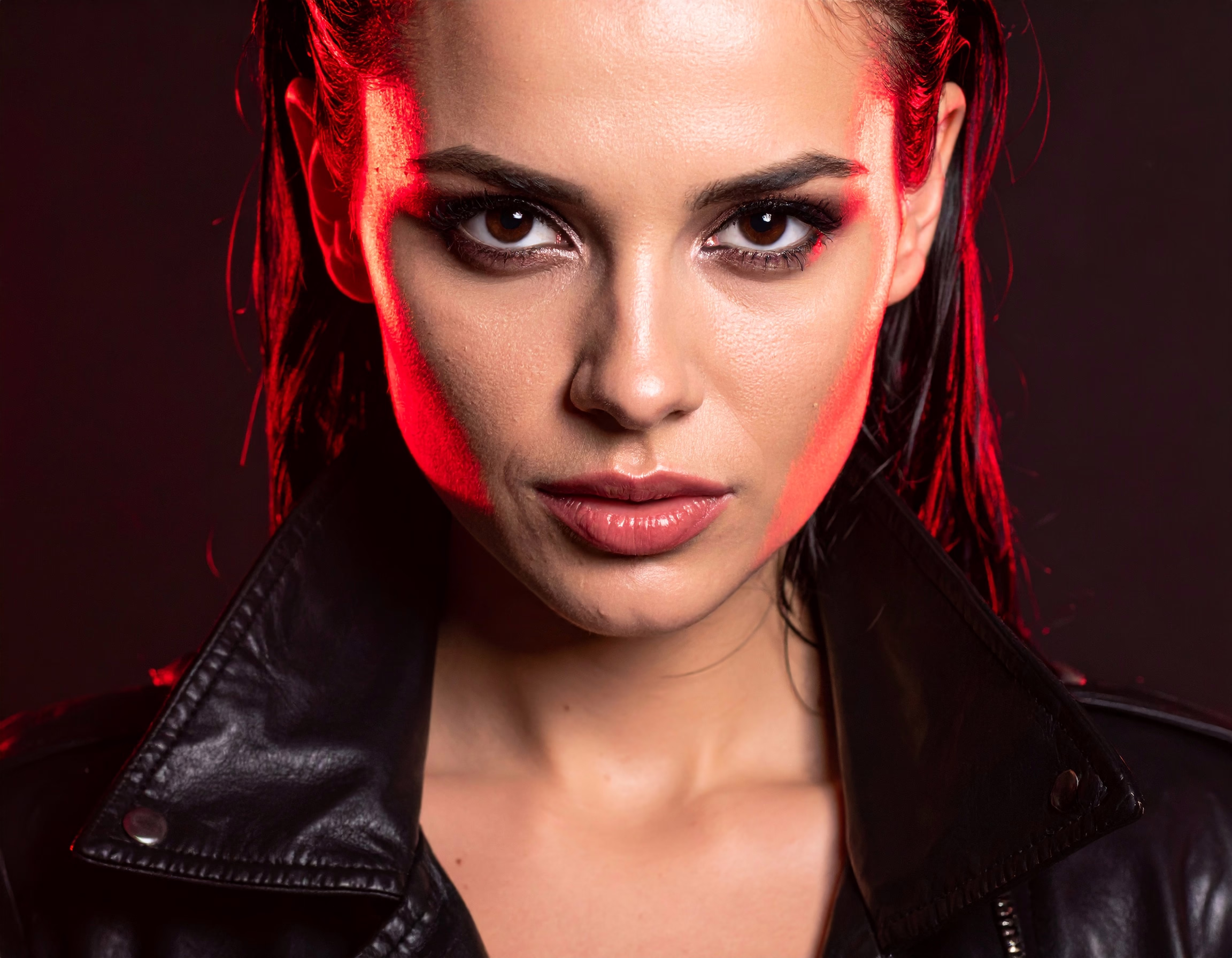 This image is classified with the tags: woman, leather jacket, red lighting, fashion, bold style.
