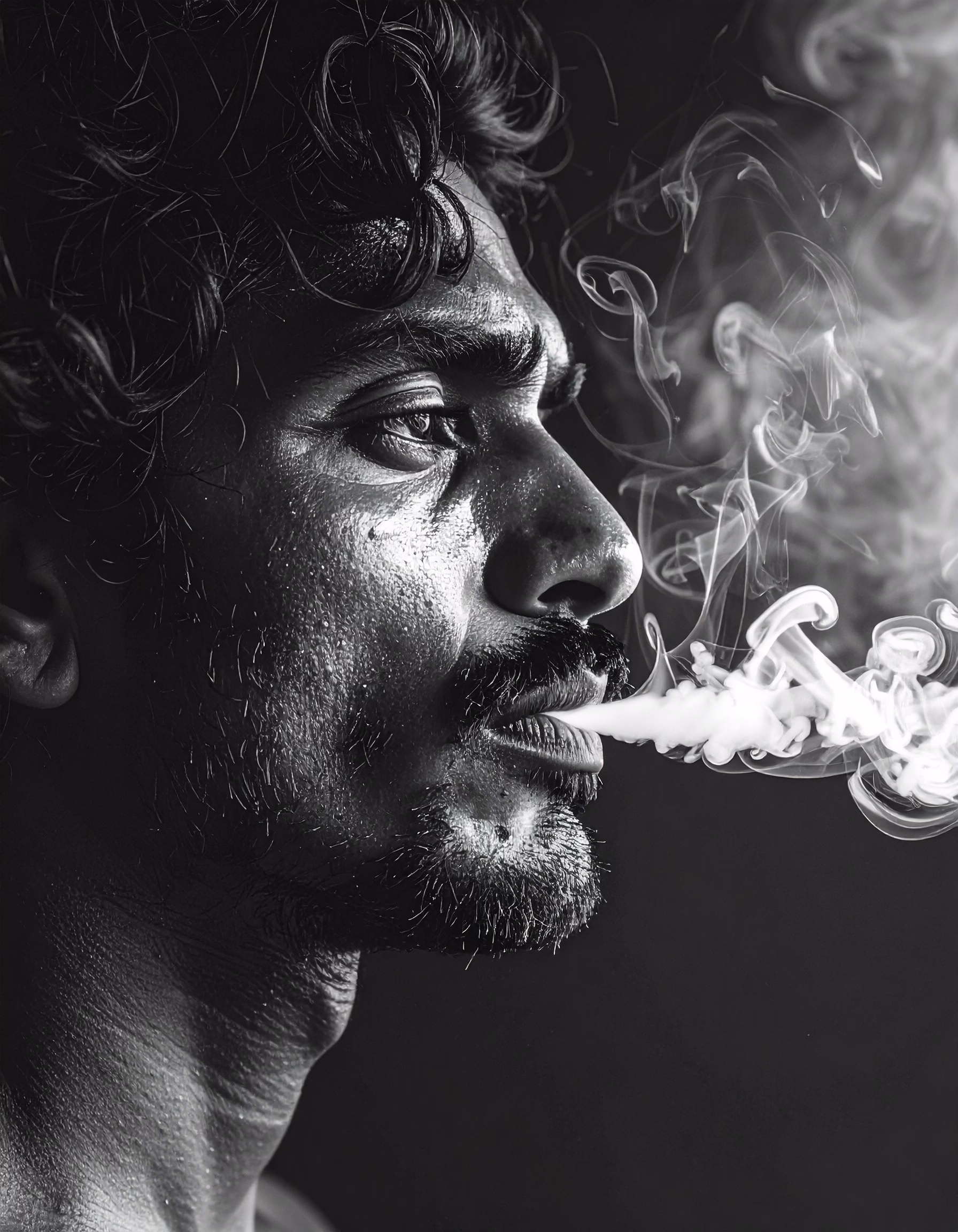 A man exhales a cloud of smoke in a dramatic black and white portrait