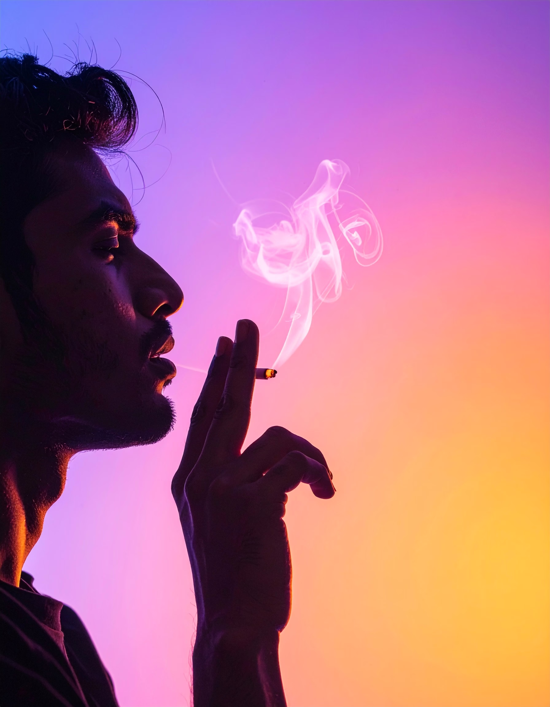 This image is classified with the tags: silhouette, smoking, vibrant colors, gradient background, youthful.