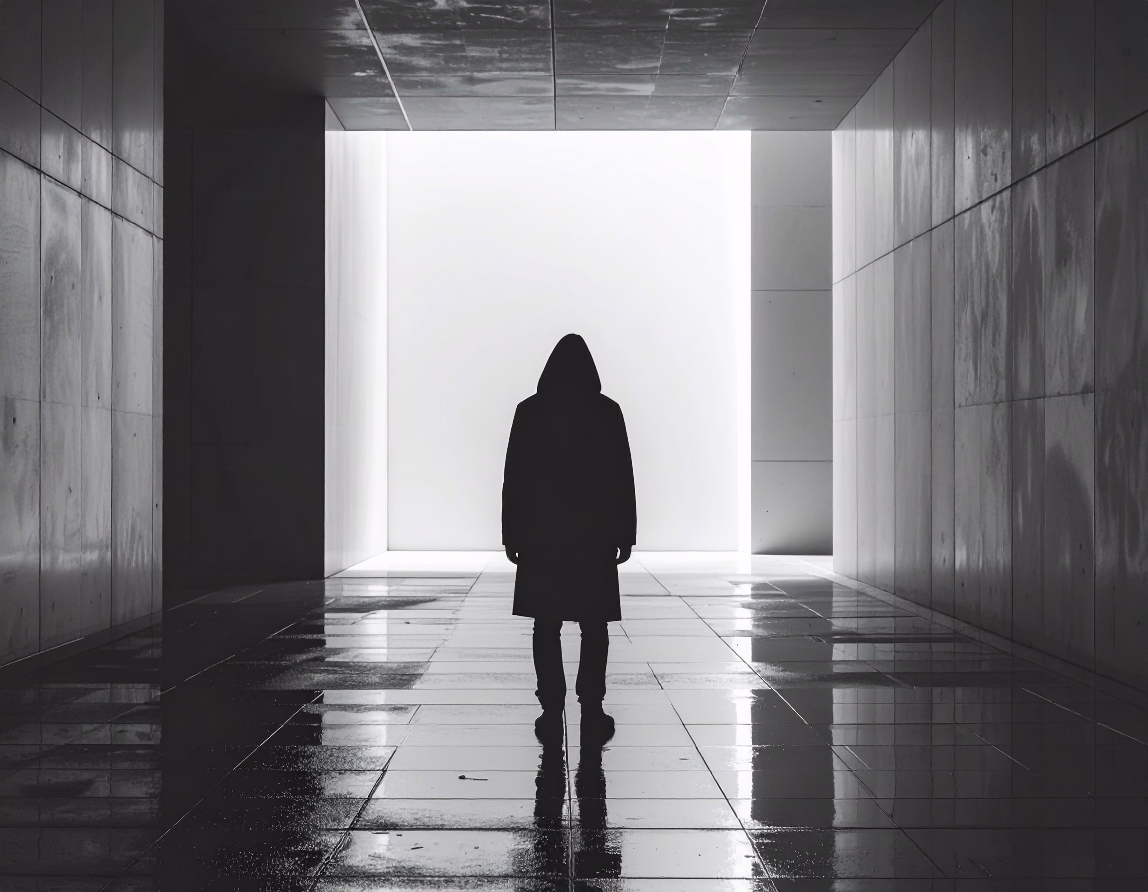 A solitary figure in a hooded coat stands in a sleek, modern corridor