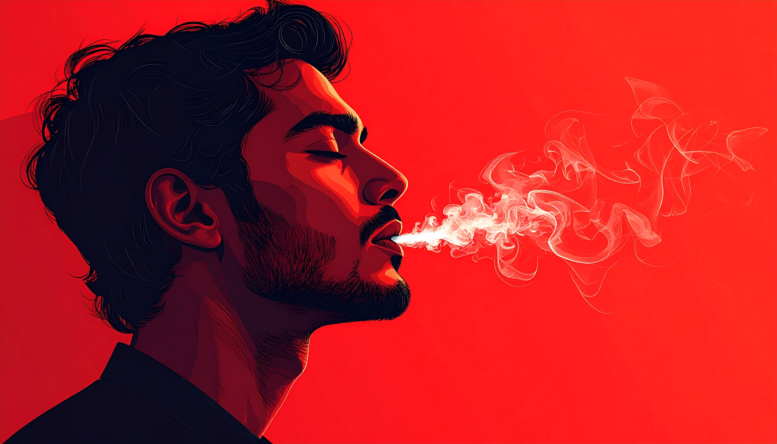 A digitally illustrated profile of a man exhaling smoke against a vibrant red background