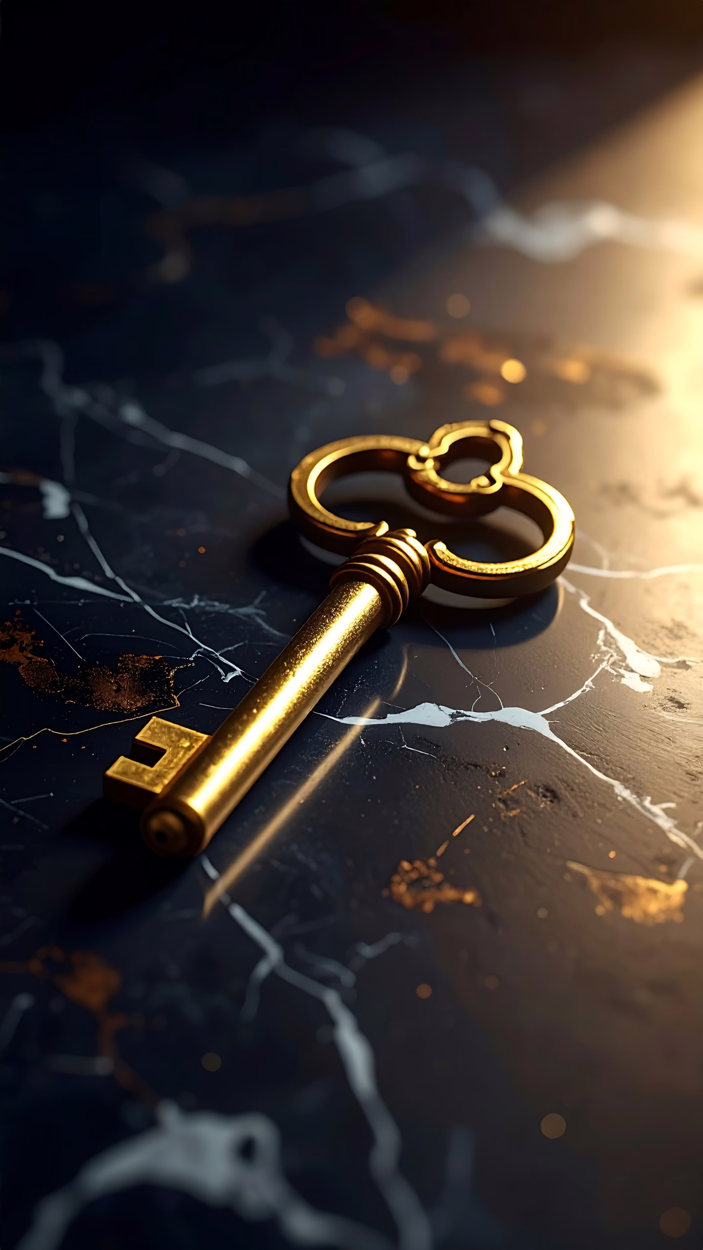 A vintage golden key rests on a dark, marbled surface with elegant reflections
