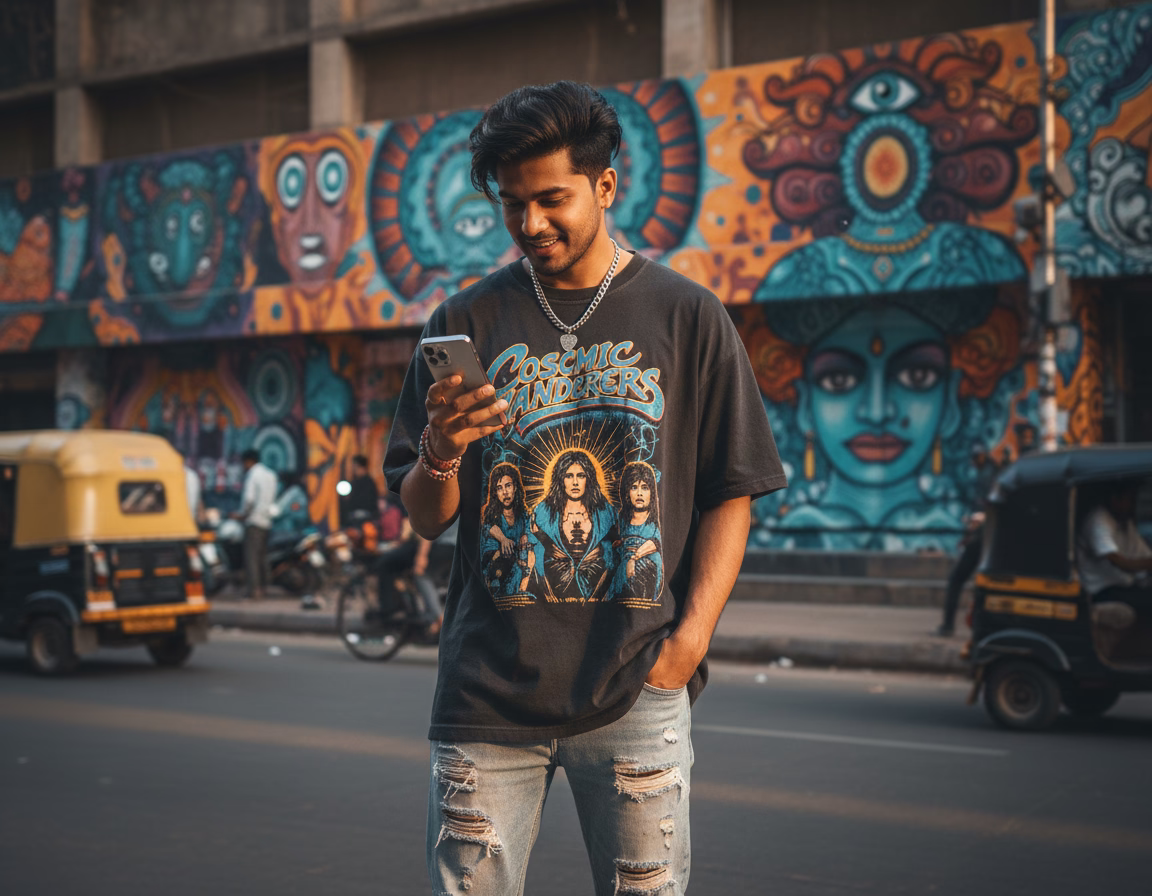 A young man wearing a graphic t-shirt stands before a vibrant urban mural in a bustling street