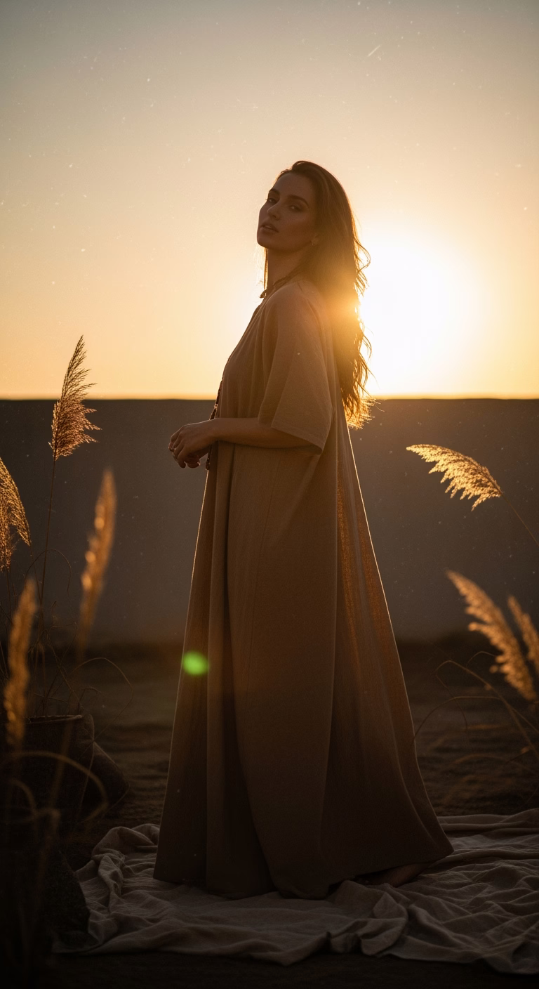 A woman in a flowing beige dress stands elegantly against a golden sunset backdrop