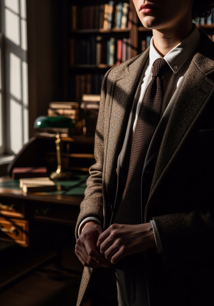 This ensemble is ideal for professionals seeking a sophisticated and timeless wardrobe addition. The suit's texture and color blend seamlessly with the warm, wood-toned background, creating an elegant atmosphere. Perfect for formal occasions or a...