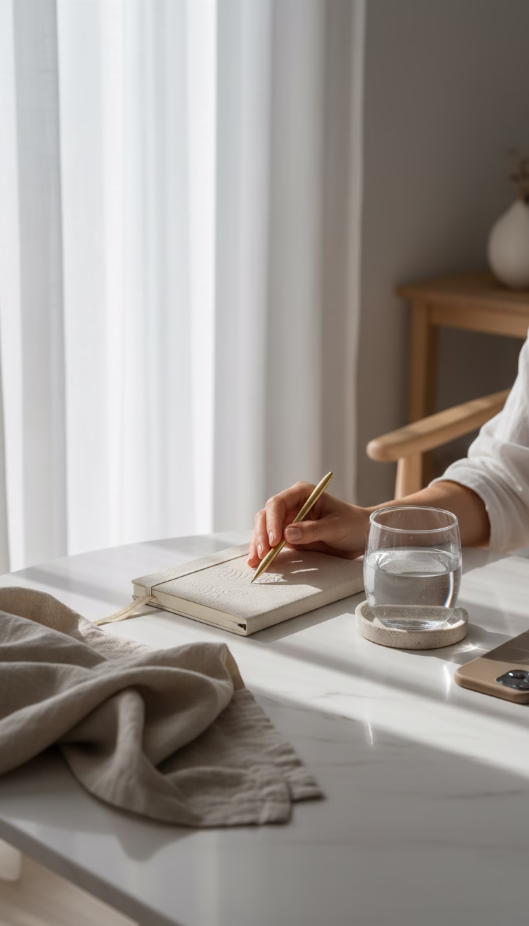 A hand elegantly writes in a textured journal on a sunlit marble table
