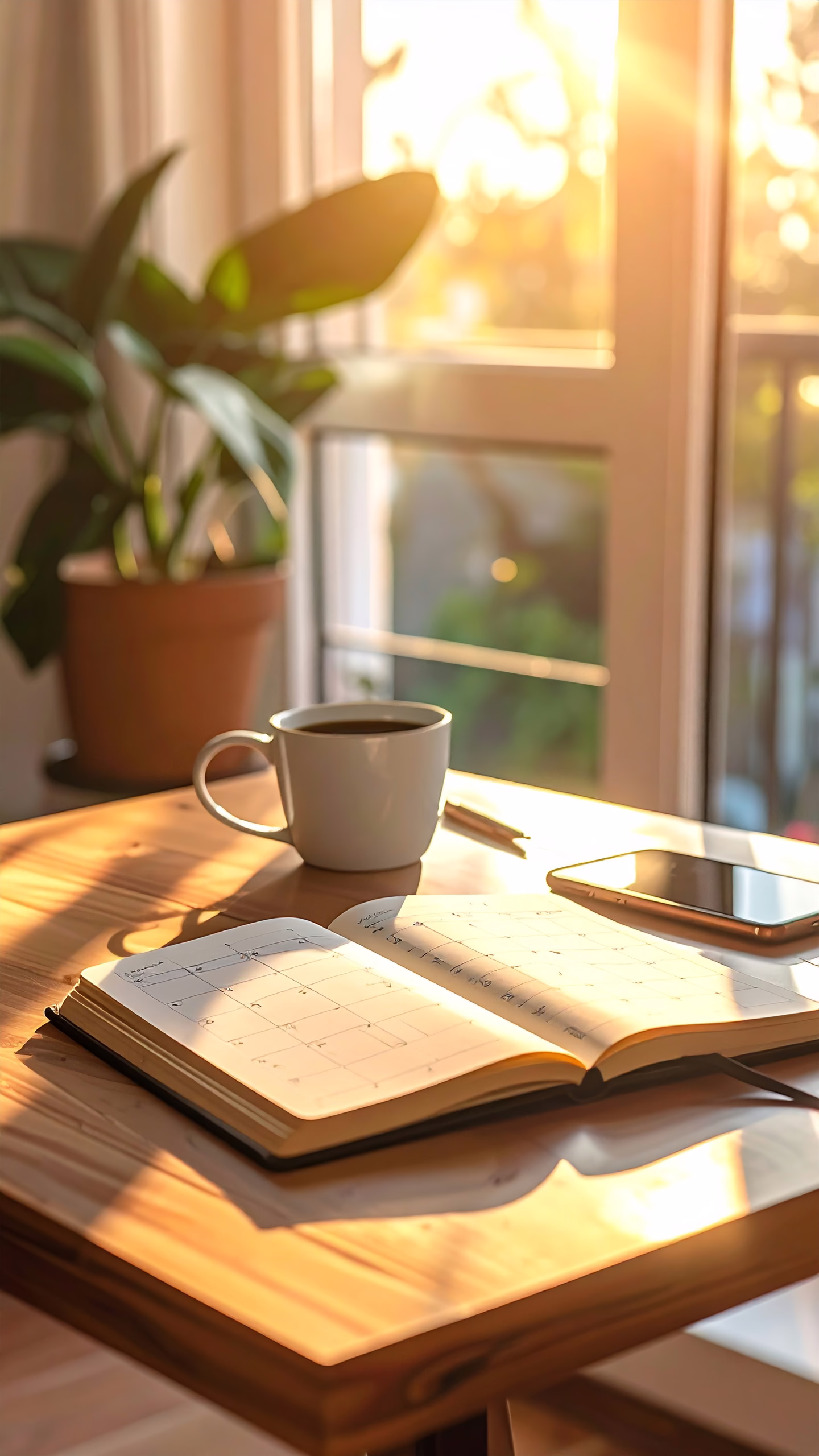 A cozy morning setup with a planner, coffee cup, and smartphone on a sunlit wooden table