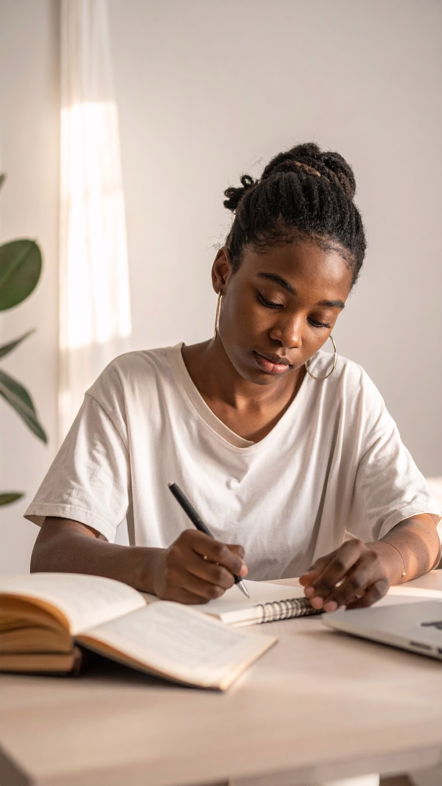 A young woman in a white shirt is engaged in writing at her desk, surrounded